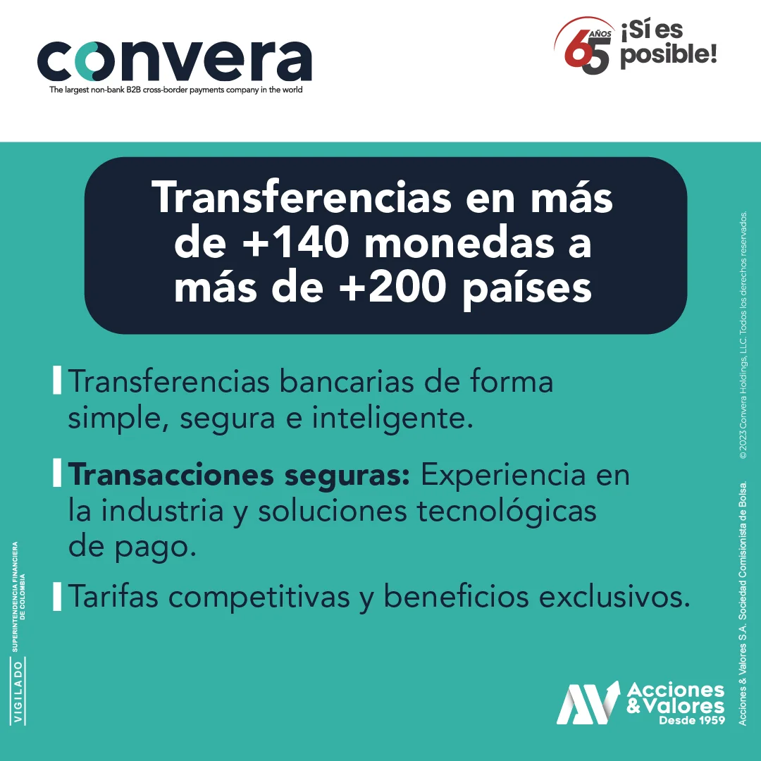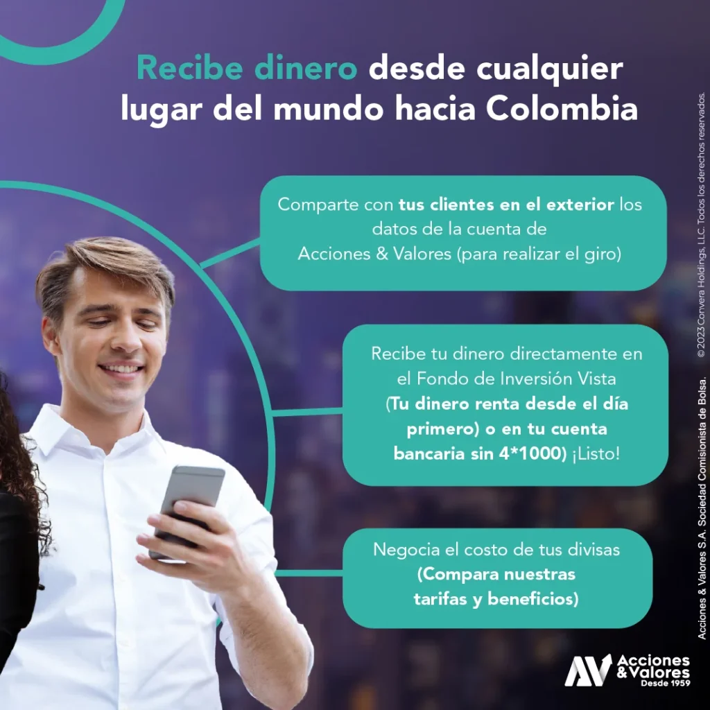 Ya sea que necesite enviar dinero a sus socios comerciales, proveedores, familiares en el extranjero, o pagar sus estudios, estamos aquí para ofrecerle un servicio eficiente y confiable. Acciones & Valores, con mas de 65 años de experiencia en soluciones financieras, le ofrece la seguridad y la comodidad de usar un servicio de transferencias internacionales que se adapta a sus necesidades.